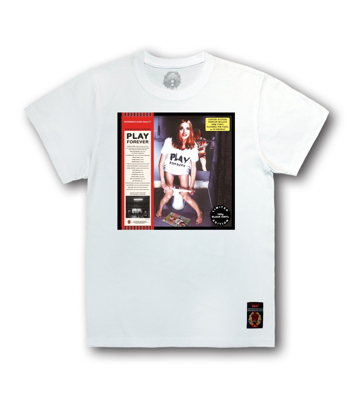 Koszulka z dużym nadrukiem okłaadki winyla PLAY FOREVER. Z tyłu koszulki na wysokości karku znajduje się mały nadruk QR SP RECORDS.