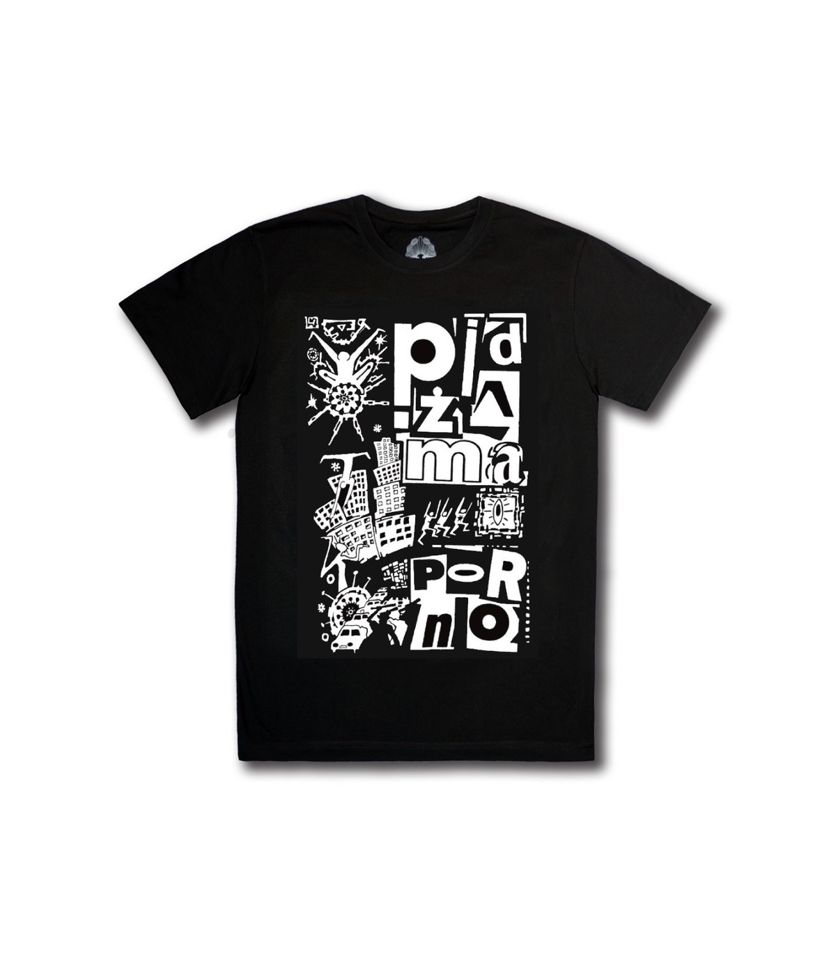 Koszulka z dużym nadrukiem pochodzącym z okładki albumu Pidżama Porno - Futurista. Z tyłu koszulki na wysokości karku znajduje się mały nadruk QR SP RECORDS.