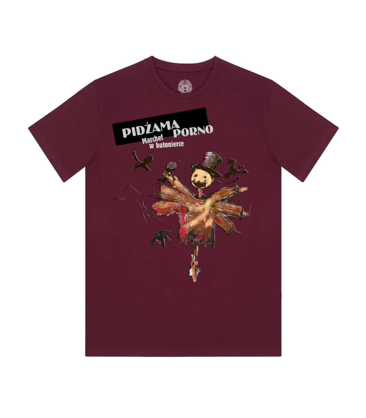 Koszulka z dużym nadrukiem winylowej okładki albumu Pidżama Porno - Marchef w butonierce. Z tyłu koszulki na wysokości karku znajduje się mały nadruk QR SP RECORDS.
