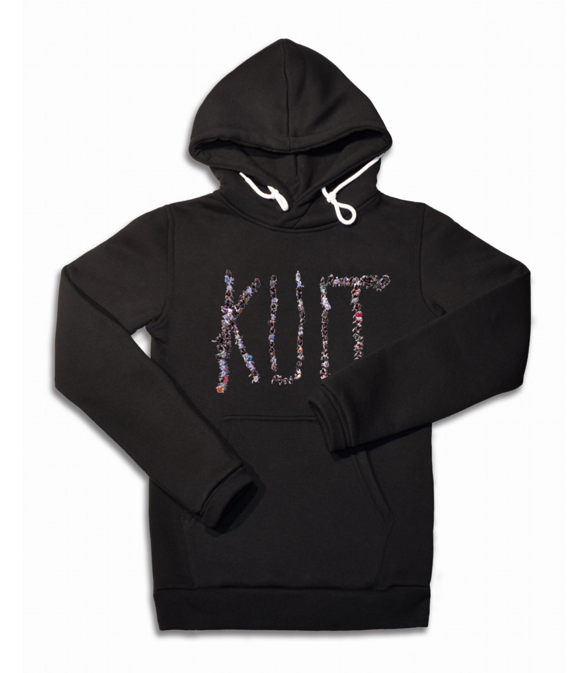 Czarna bluza z kapturem wkładana przez głowę. Z przodu znajduje się duży napis pochodzący z okładki boxu winylowego Kultu - Tenerife 2024. Z tyłu bluzy na wysokości karku znajduje się mały nadruk QR SP RECORDS.